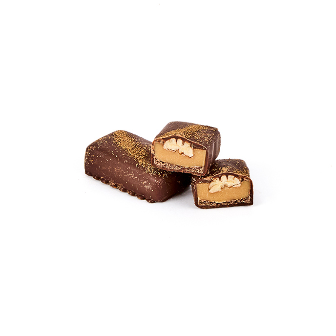 Golden, gooey butterscotch caramel at its highest frequency – chewy, smooth, lightly sweetened and encased in a rich cacao shell. Lightly dusted with antioxidant-rich cinnamon sugar and found within a crisp, organic maple-roasted pecan – the most popular truffle bar earned its status for good reason.