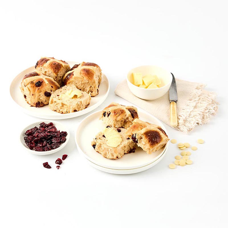 Freshly baked Hot Cross Buns are a staple at Easter time and we’ve taken this classic favourite and added a twist. Our White Chocolate and Cranberry Hot Cross Buns are choc full of rich and creamy white chocolate buttons but still have the delicious fruitiness and a hint of cinnamon that everybody already loves in a Hot Cross Bun.